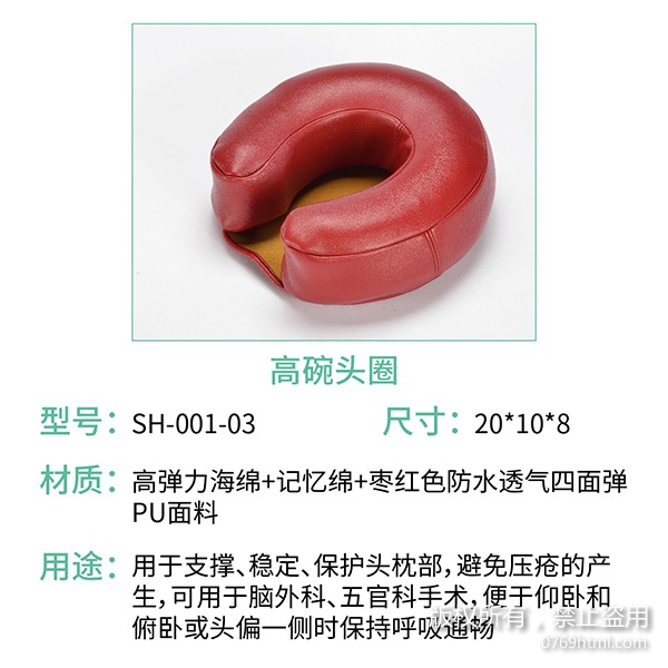 蒙泰手術(shù)體位墊系列中的高碗頭圈主要由高彈力海綿、記憶棉、棗紅色防水透氣四面彈PU面料組成,主要用于支撐、穩(wěn)定、保護頭枕部,避免壓瘡的。如果您還想了解更多內(nèi)容,歡迎咨詢蒙泰護理哦!