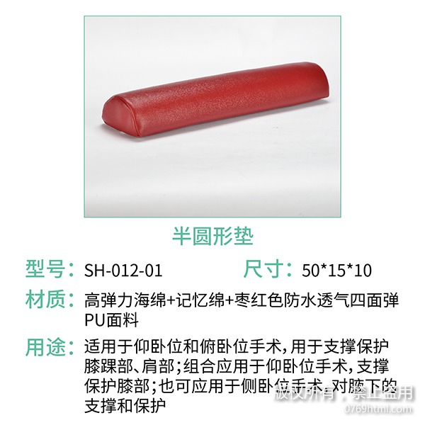 海綿體位墊系列中的半圓形墊,適用于仰臥位和俯臥位手術(shù),常用于支撐保護(hù)膝踝部、肩部、組合應(yīng)用于仰臥位手術(shù),支撐保護(hù)胸部和髖部;也可用于側(cè)臥位手術(shù)等,對腋下的支撐和保護(hù)。而且半圓形墊是手術(shù)室護(hù)理中較常用到的體位墊之一,常規(guī)尺寸為50*15*10,如果這個尺寸與您所找的尺寸不符合,也是可以進(jìn)行定制服務(wù)